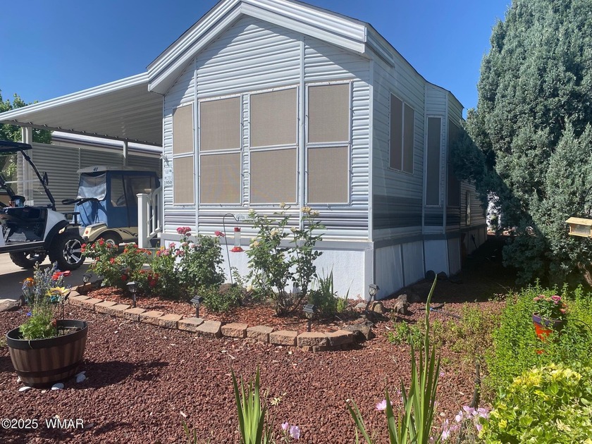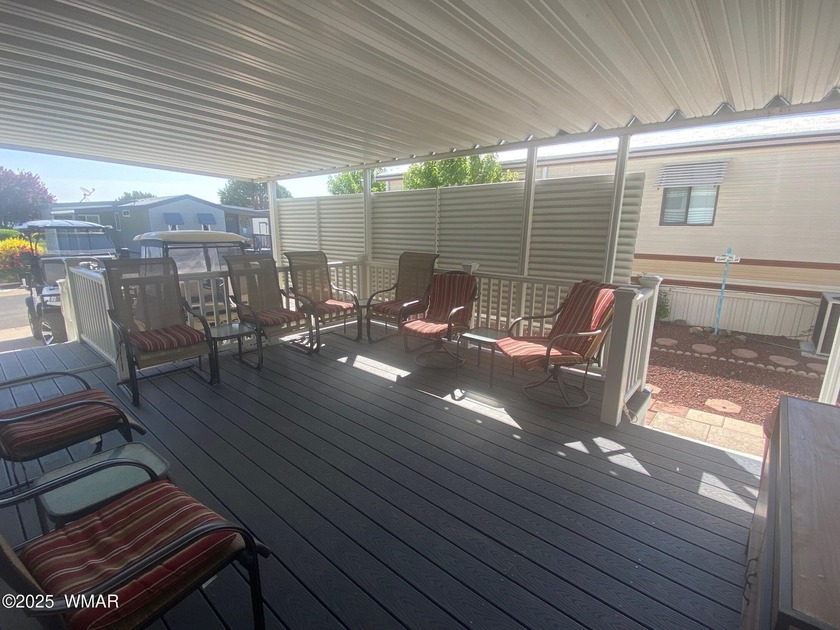 This cozy, bright park model home features a huge covered deck